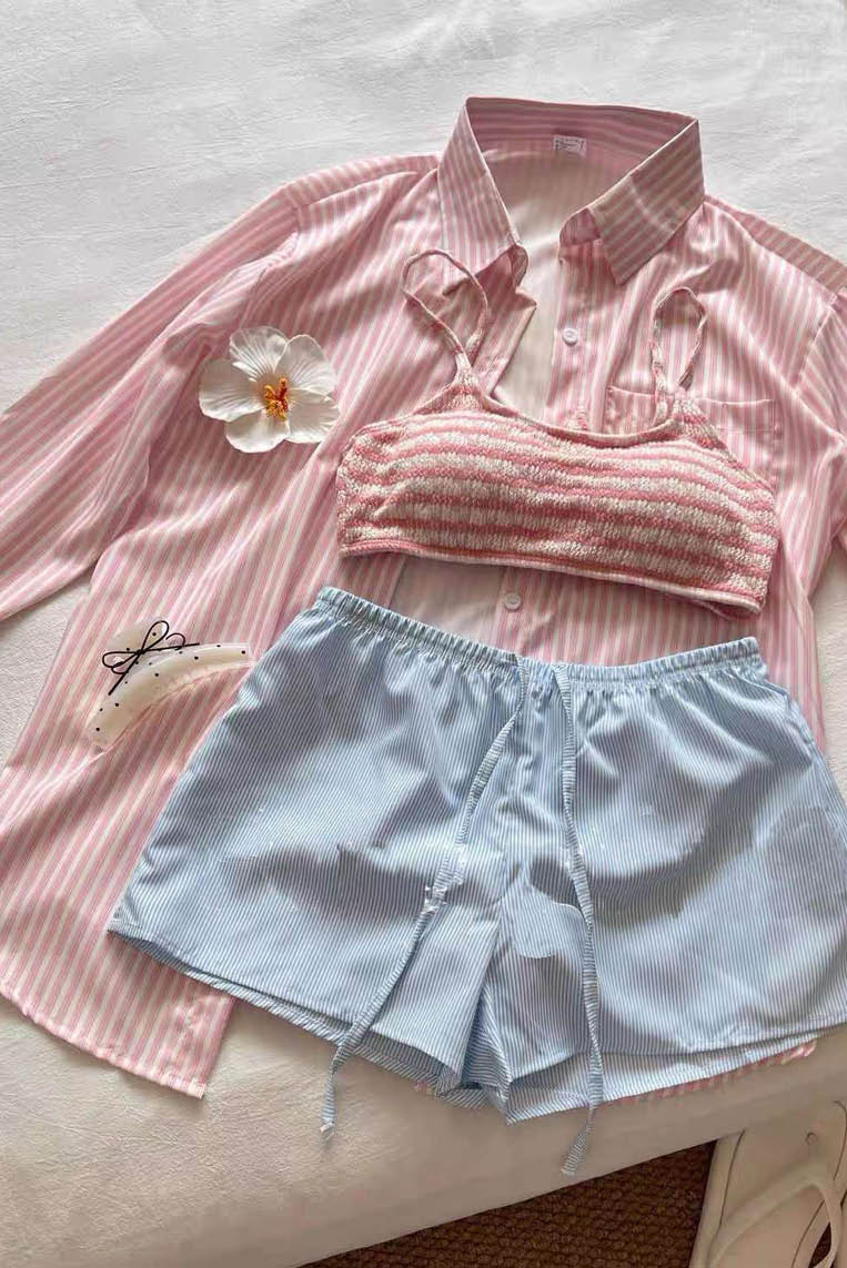 粉嫩少女系4件套泳装(附条纹长袖衫)