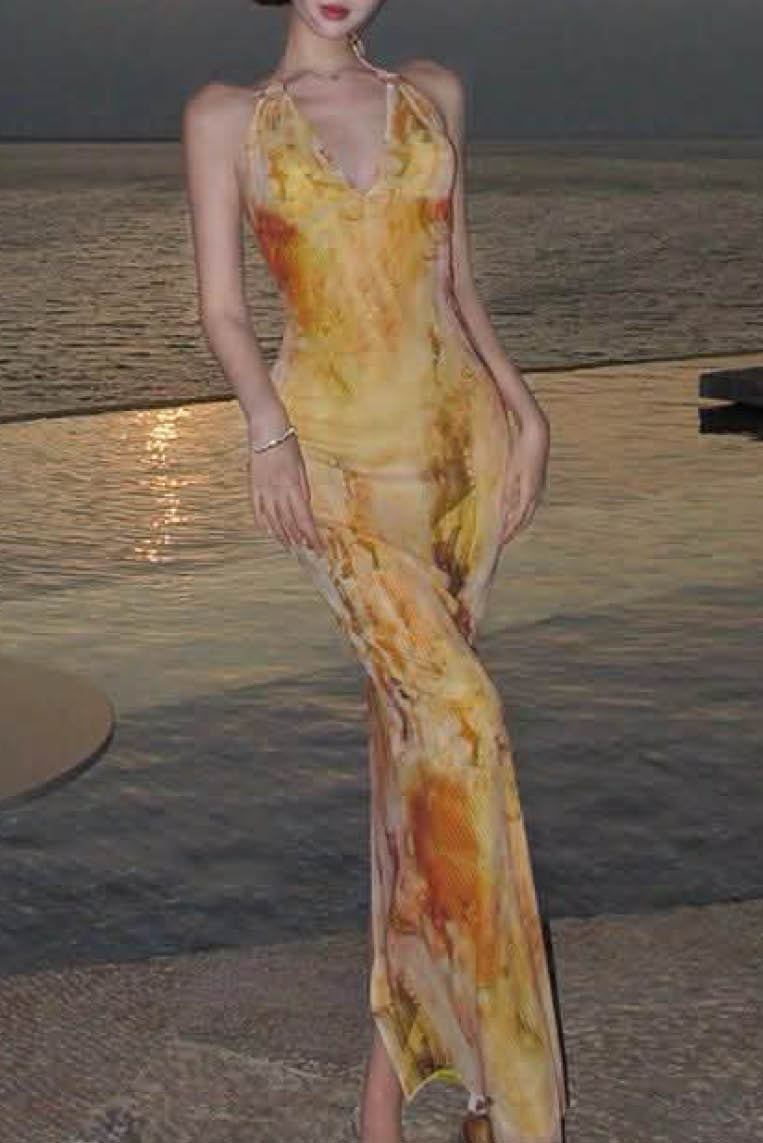 扎染印花露背包臀长裙 (无胸垫)