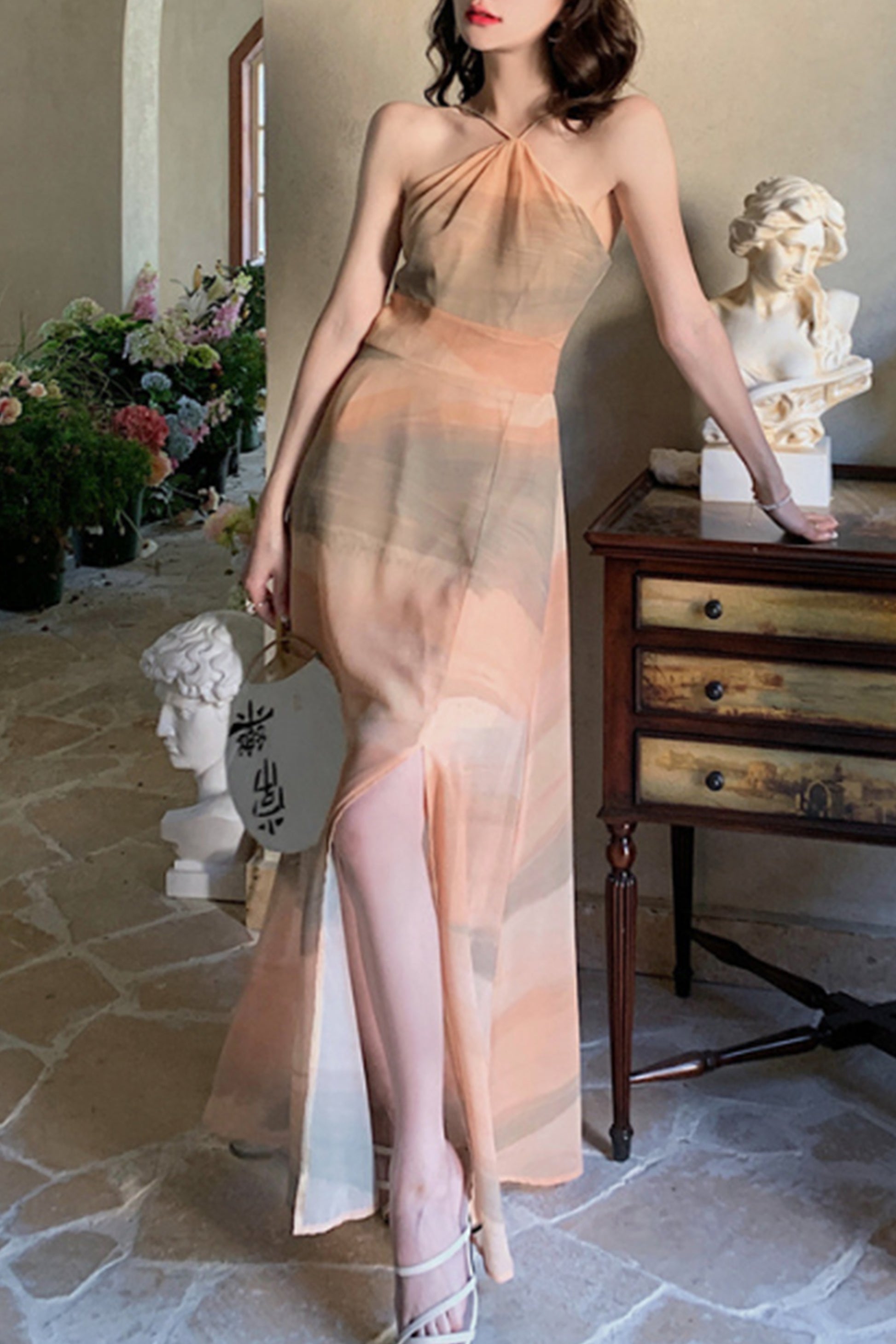 印花雪纺开叉露背裙子