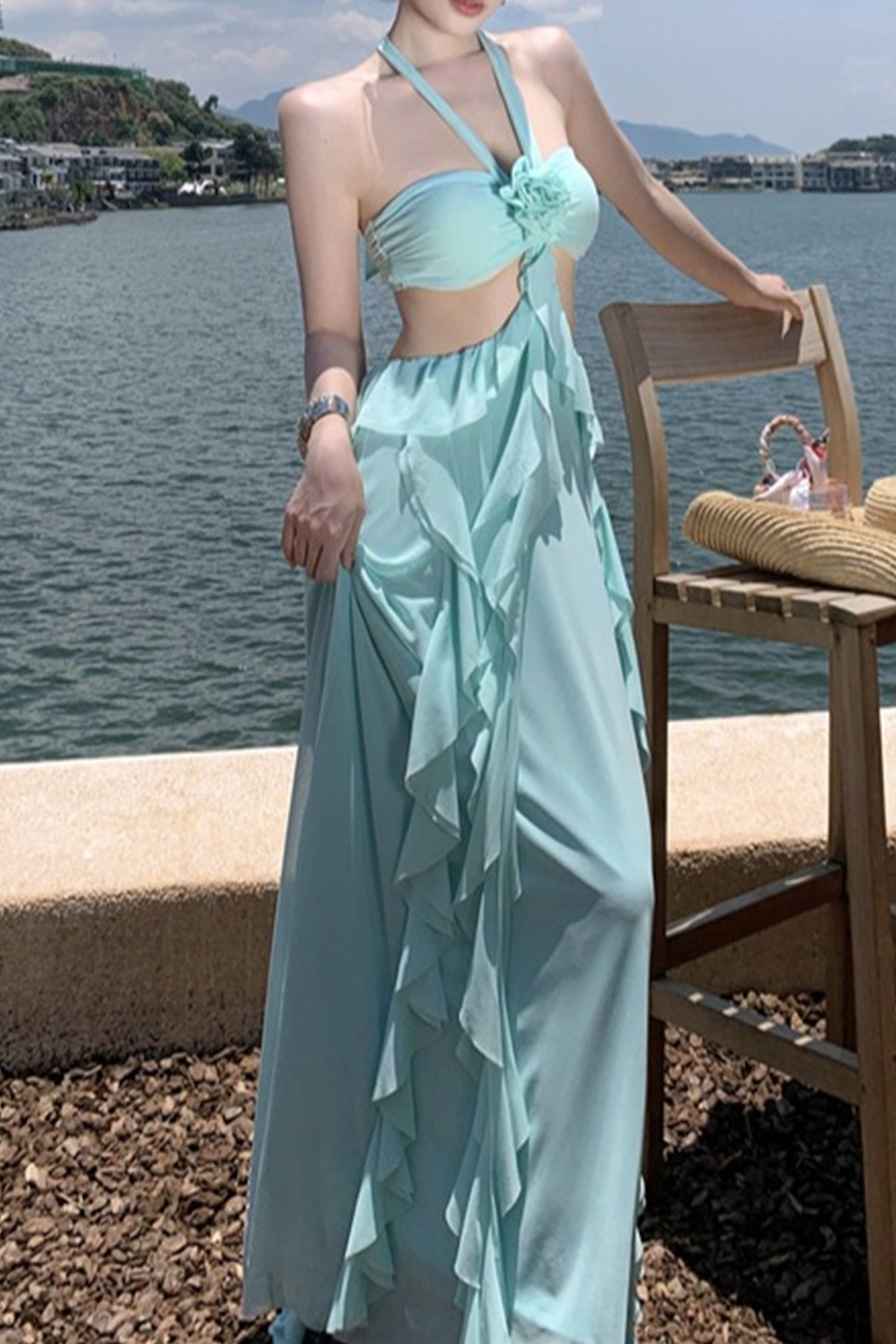 性感露腰荷叶边连衣裙