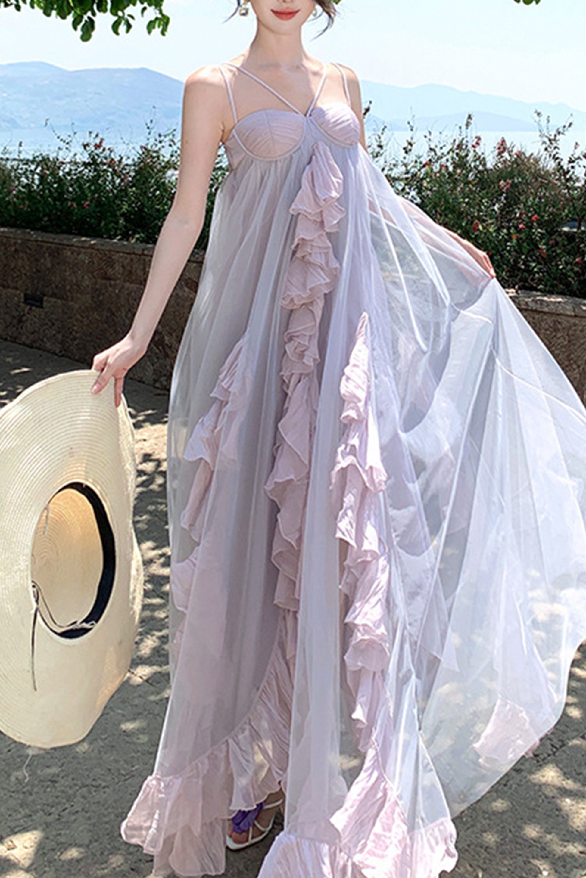 荷叶边雪纺度假网纱吊带裙